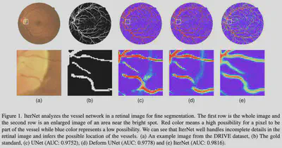 網膜画像中の血管を見ると、人の循環器システムに関する様々な情報を取り出すことができ、眼科のみではなく様々な診療科で活用されています。我々は、血管の自動抽出を目指して、IterNetという、深層学習を利用した新しい手法を開発しました (図(e))。
